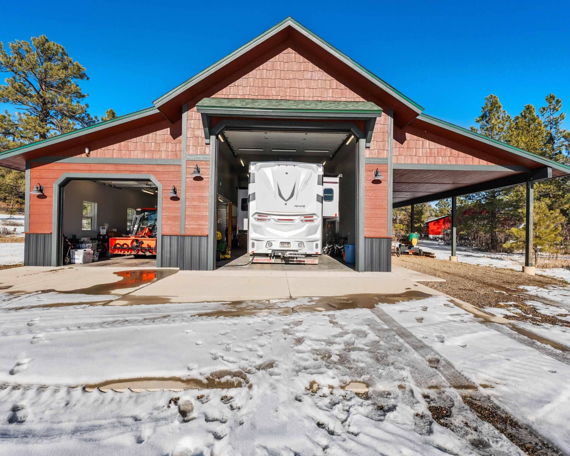 For adventurers and gear enthusiasts, the 2,200-square-foot heated RV garage is a standout feature. With full hookups and ample space, it easily accommodates RVs, boats, snowmobiles, trailers, and recreational equipment, all stored securely and year-round.