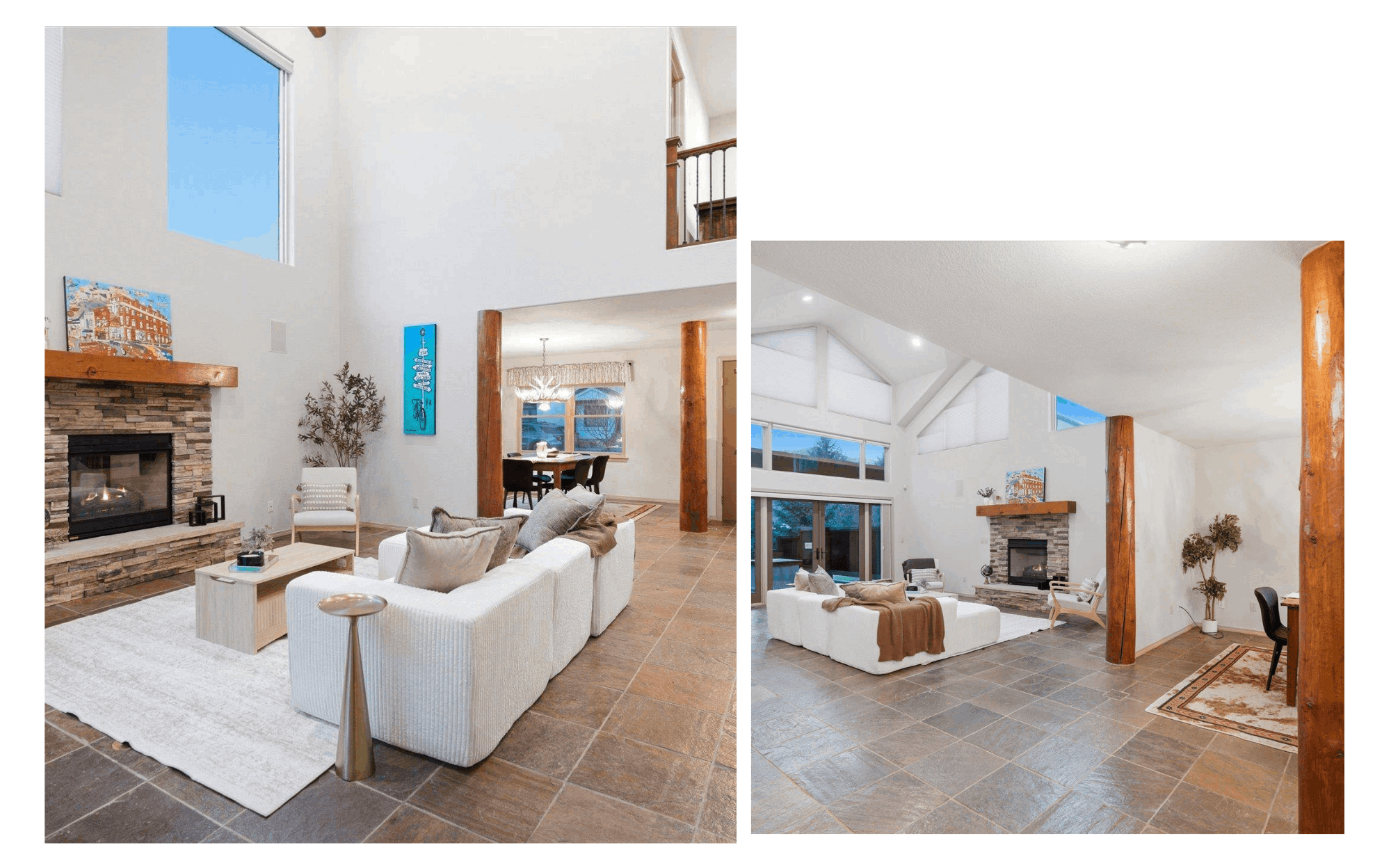A cozy gas fireplace serves as the focal point of the living area, providing warmth and ambiance during cooler mountain evenings. Elegant slate flooring and distinctive log accents add authentic Colorado character while maintaining a refined, modern aesthetic.